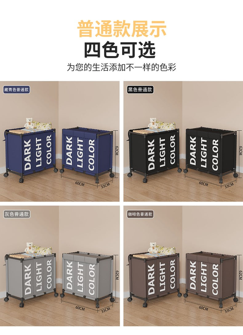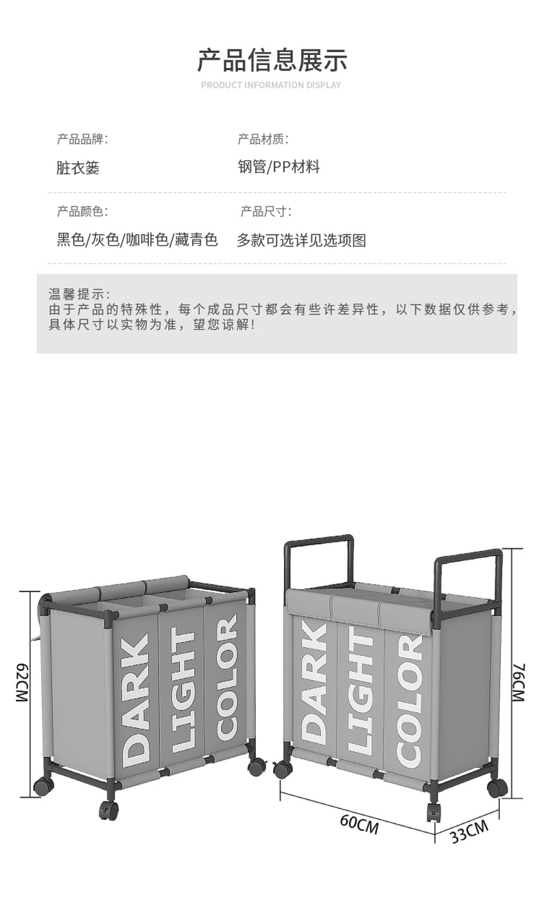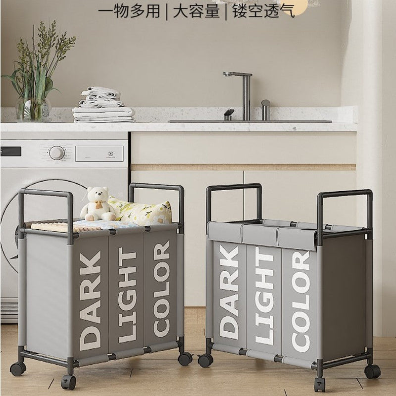 The 3 Compartment DIY Dirty Clothes Hamper / Basket With Roller with No Handle is Tool Free Assembly, simple to install and convenient for managing your dirty clothes and saving space; it also features a strong load-bearing capacity, classified storage, and breathable non-woven fabric that is ventilated and resistant to moisture.